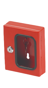 Secure and organize your keys with this wall-mounted key box, designed for quick access in emergencies. It features a durable two-piece construction with a break-glass front for immediate entry when needed. The unit is finished in a red epoxy electrostatic powder coating for enhanced durability and visibility. Made from mild steel and suitable for surface wall mounting, it provides a dedicated space for hanging keys securely. Dimensions: 150 × 120 × 40 mm.